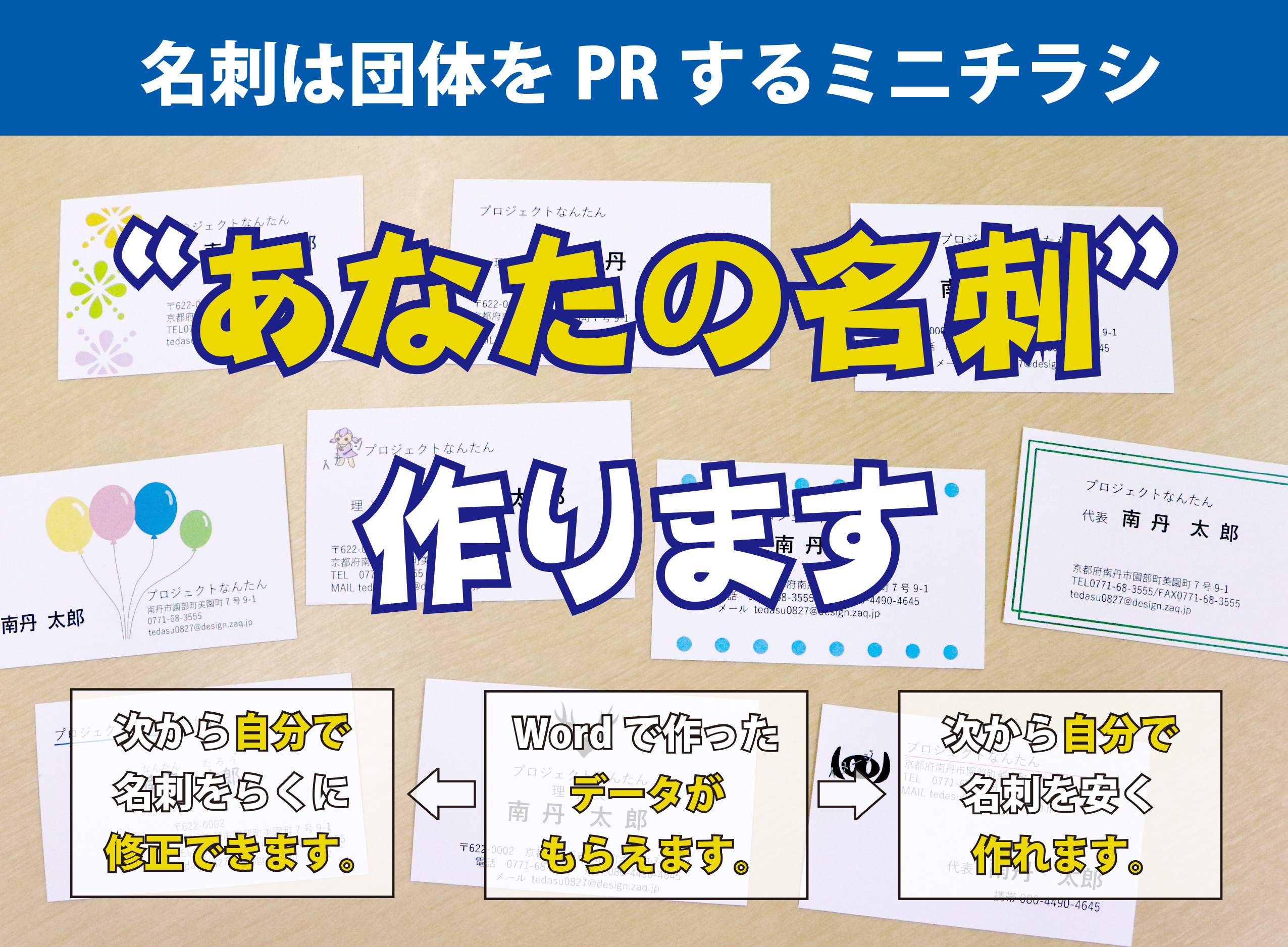 10パターンのデザインからお好みのものを選んでいただき、Wordを使って名刺をデザインします。